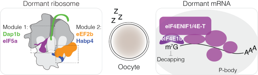 As maternal mRNAs are stockpiled in the mature oocyte, robust translational repression mechanisms must be established to (1) conserve cellular energy and (2) prevent premature protein synthesis, which could be detrimental to embryonic development. During my postdoctoral work, I identified two distinct mechanisms that repress translation at the level of ribosomes and mRNAs (Figure 1).