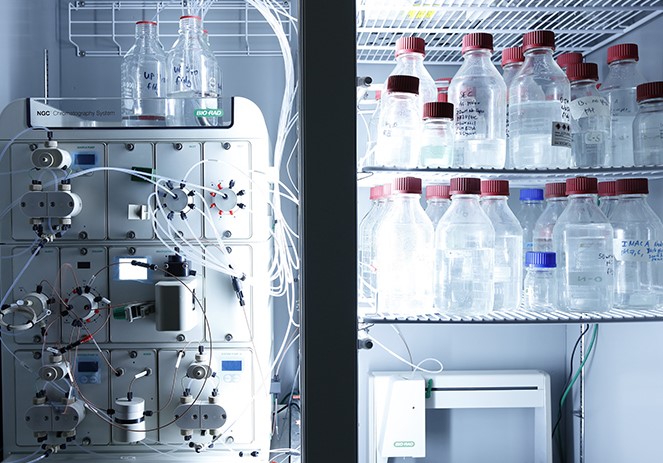 Our unit is equipped with five fast protein liquid chromatography (FPLC) systems, which can be accessed by trained users. Since August 2022, we also provide training for using the Helix+, which allows chip-based determination of biomolecule interaction kinetics (association- and dissociation constant measurements). We have six incubation shakers, a cell culture area, as well as a Branson Sonifier. A full list of our available equipment can be found in OpenIRIS, our online booking system. For a more detailed description of our instruments, please refer to our intranet page.