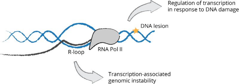 Interplay between transcription and genome stability maintenance. Transcription can pose a threat to genome stability through the frequent formation of RNA-DNA hybrids with a displaced single-stranded DNA or R-loops. Transcription-blocking lesions induced by UV light trigger global regulation of different RNA metabolic processes including transcription, alternative splicing and RNA stability.
