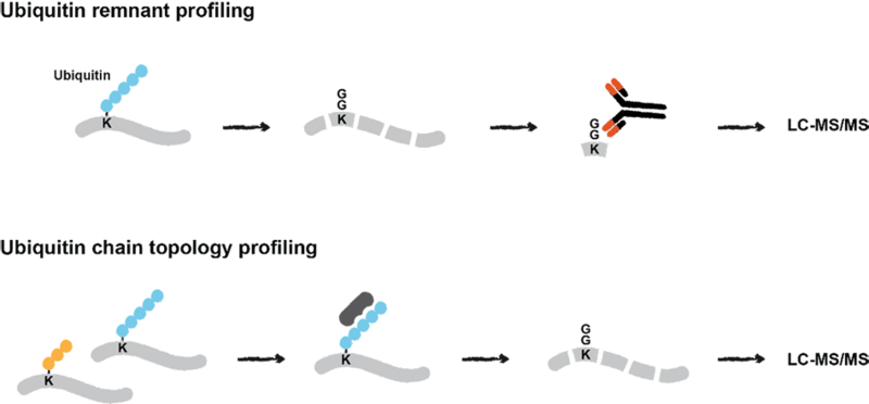 Quantitative mass spectrometry-based proteomics approaches for interrogation of ubiquitin signalling. Ubiquitin remnant profiling enables quantification of endogenous ubiquitylation sites in response to cellular stress. The presence and abundance of different ubiquitin chains on proteins is investigated by their enrichment using chain-specific binders and subsequent LC-MS/MS analysis.