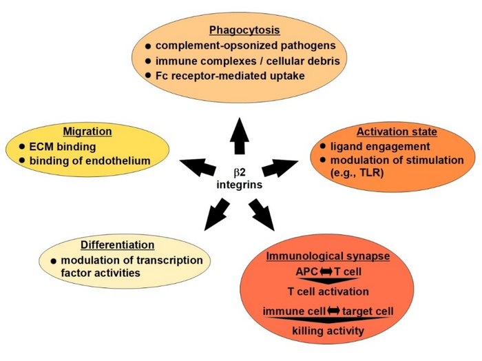 β2 integrin receptors consist of a variable alpha (CD11a-CD11d) and a constant beta (CD18) subunit and are expressed specifically by leukocytes. CD11a/CD18 (LFA-1) and CD11b/CD18 (MAC-1) bind ICAMs, thereby providing a scaffold for interactions between immune cells (for example, APC with T cells), termed an immunological synapse. Furthermore, LFA-1 and MAC-1 enable rolling of leukocytes along the endothelium to search for sites of inflammation. In addition, some β2 integrins (MAC-1 and CD11c/CD18) function as phagocytic receptors for complement-opsonised pathogens and immune complexes. In general, the triggering of β2 integrins influences various cellular signalling processes in a cell type-specific manner.